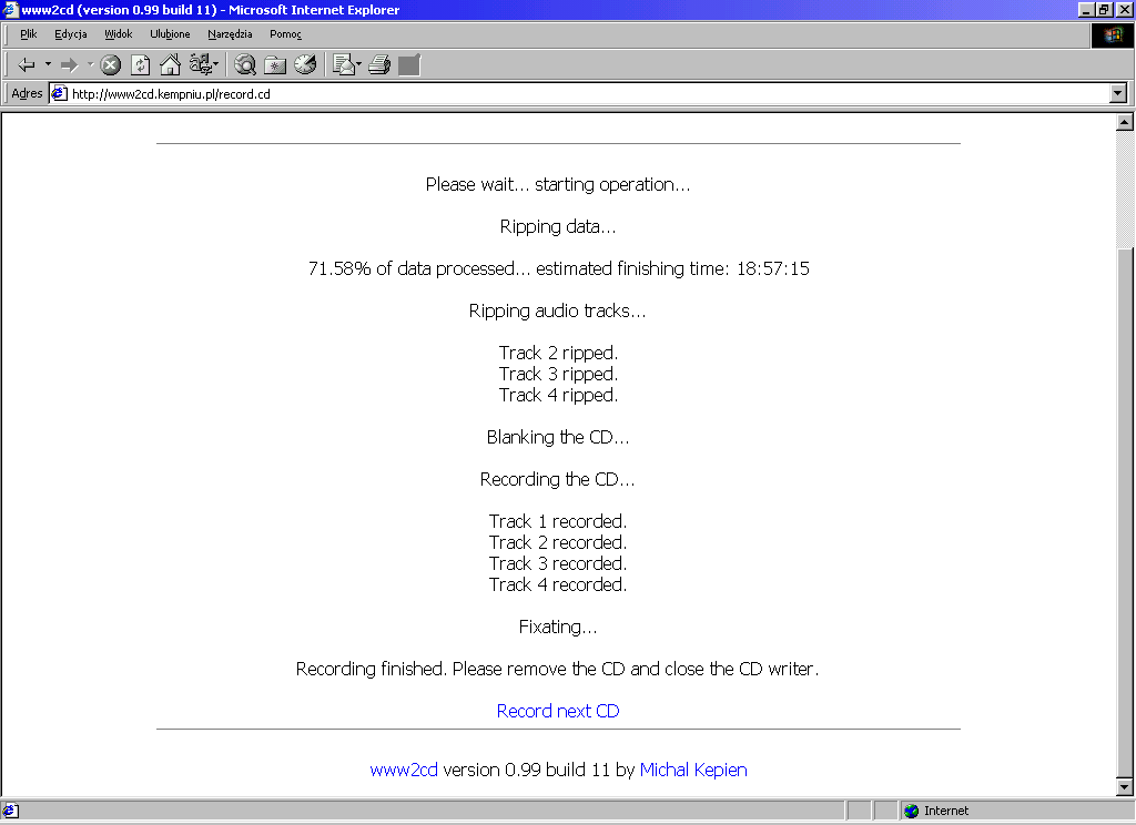 www2cd enables you to easily convert MP3 files to audio tracks, record data, audio and mixed type (data + audio) CDs or copy CDs (also the mixed type ones) with one click!